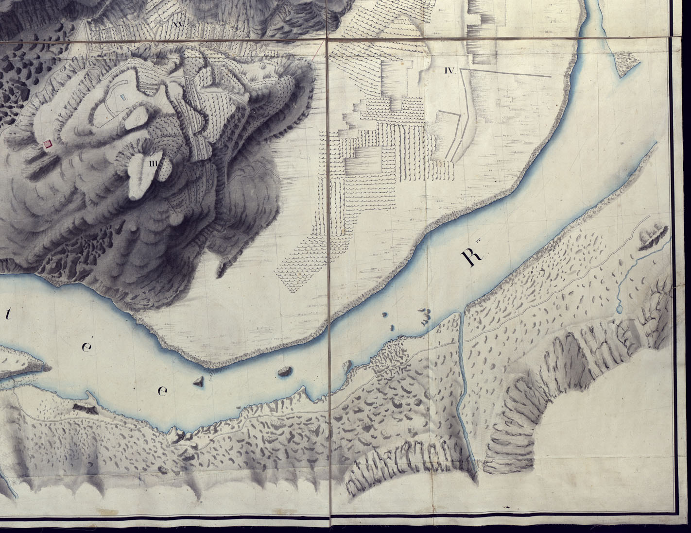 "Grande disegno ad acquerello montato su tela a stacchi con orografia a sfumo, abitati in rosso, acque in azzurro. E' orientato col nord spostato verso sinistra. A sinistra elenco numerico dei nomi principali."