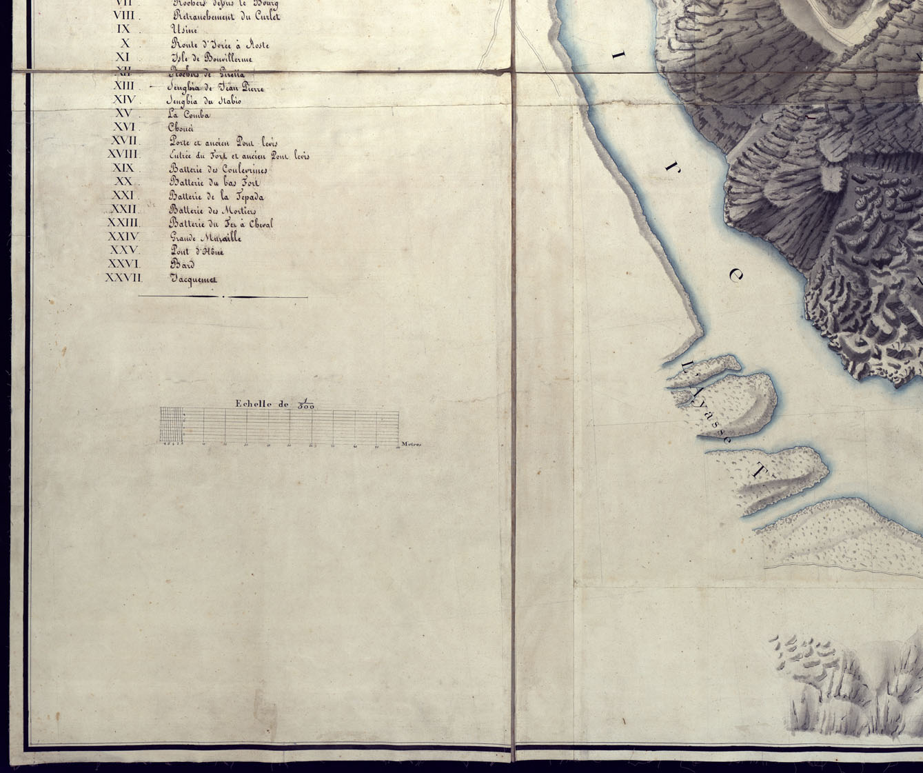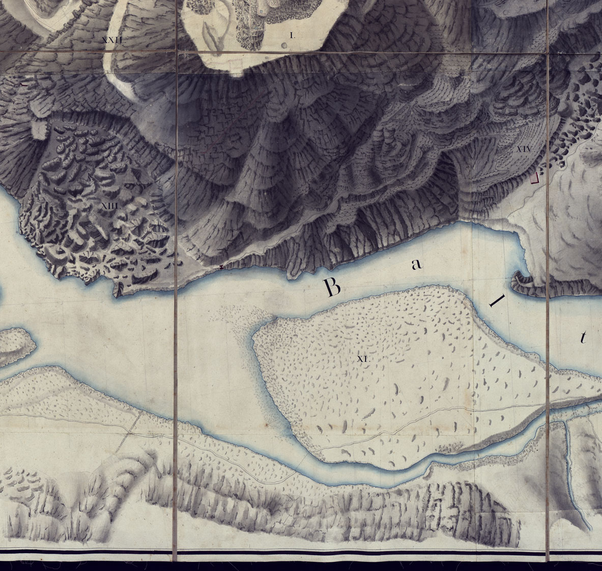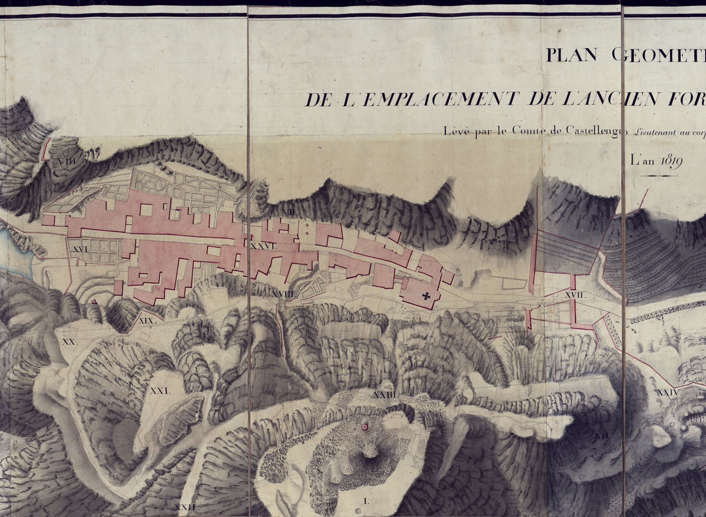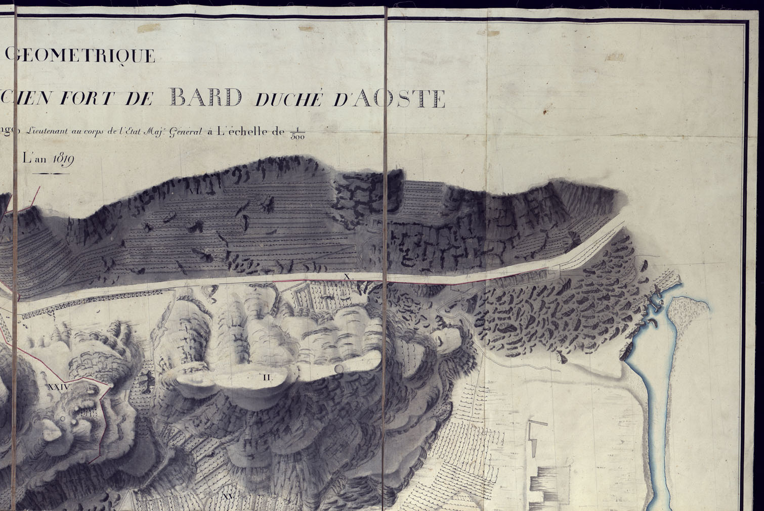 PLAN GEOMETRIQUE DES ENVIRONS DE L'ANCIEN FORT DE BARD DUCHE' D'AOSTA, LEVE SUR UN RAYON DE 2.600 METRES A'L'EHCELLE DE 1/5.000 PAR M. BASSO DESSINATEUR A' L'ETAT MAJOR GENERAL L'AN 1819.