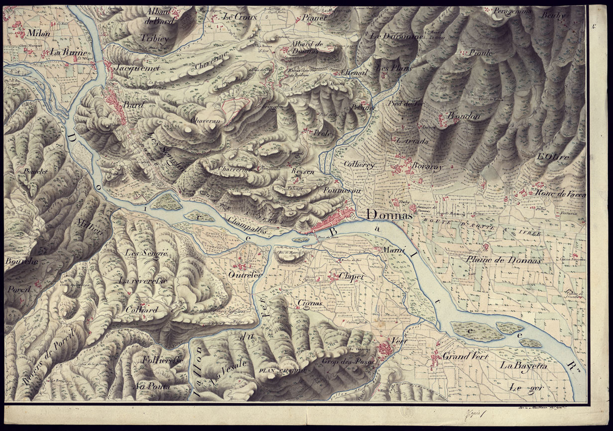 "Documento in quattro fogli. Disegno ad acquerello assai accurato con orografia a sfumo a luce obliqua, abitati in rosso, acque in azzurro, vegetazioni in verde. Strade distinte in sette classi. Firmato dal Mag. Gen. Monthoux. Al documento n°125 vi è un altro esemplare montato su tela a stacchi."
