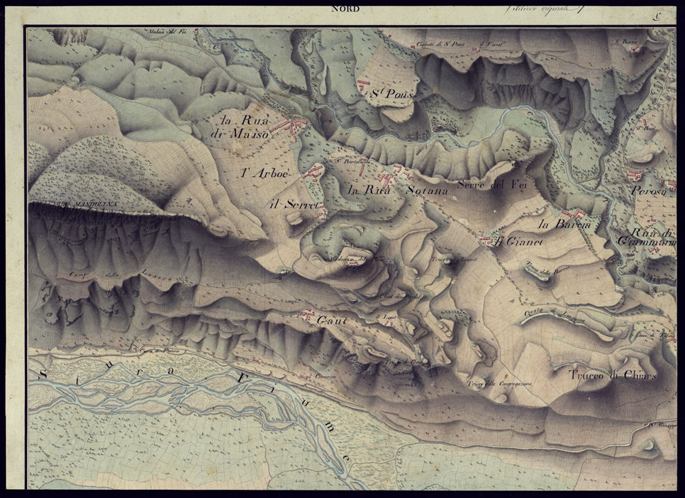 "Rilievo in quattro fogli, ad acquerello eseguito dall'Ing. Rinaudo d'ordine del Magg. Gen. Barone di Monthoux. Orografia a sfumo, abitati in rosso, acque in azzurro, vegetazioni in verde. Scale in trabucchi e in metri. Altro esemplare al documento N°131 a cui mancano data e firma ma vi sono annessi due lucidi dei fogli 1 e 2."