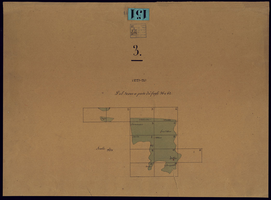 "Gruppo di tredici mappe catastali ad acquerello, unite a mosaico. Recano le firme dei geometri Occelli, Saluzza, Fedeli e Avanzati. Rappresentano l'orografia con lo sfumo a luce obliqua, abitati in giallo, terreni coltivati ecc. Vi è annesso un quadro d'unione e una "Riduzione fatta dal Sig. Occelli della Mappa del Territorio di Sagliano, provincia di Bobbio" pure alla scala di 1:9.450."