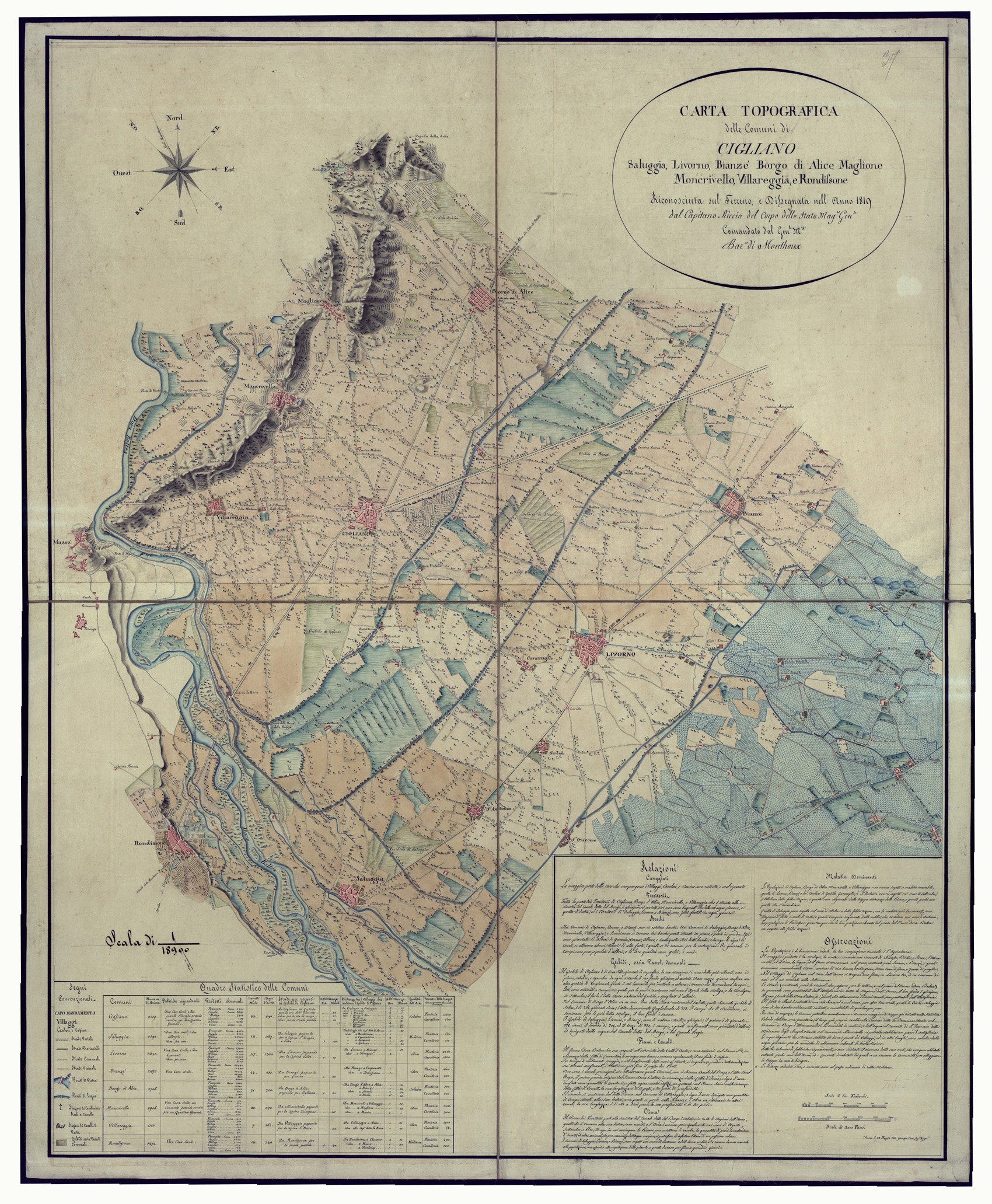 "Saluggia, Livorno, Bianzè, Borgo di Alice, Maglione Moncrivello, Villareggia e Rondisone. Riconosciuta sul Terreno e Disegnata nell'anno 1819 dal Cap. Riccio del Corpo dello Stato Maggiore Generale comandato dal Gen.le Magg.re Bar di Monthoux. Disegno ad acquerello montato su tela a stacchi. Orografdia a sfumo a luce obliqua, abitati in rosso, acque in azzurro, terreni coltivati in verde. In basso la leggenda dei segni convenzionali, dati statistici e notizie descrittive, firmate Giuseppe Conti, Ingegnere disegnatore, alla data 23 maggio 1821. Il documento N°153 è un altro esemplare a firma del Ten. Roggero."