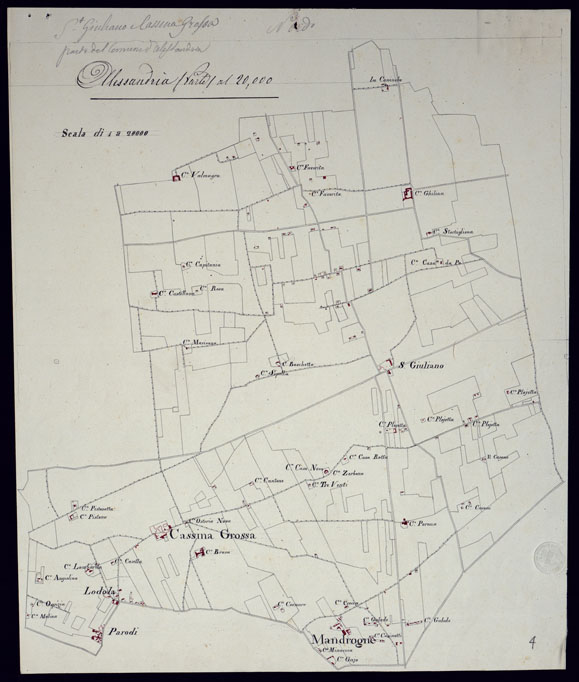 "Il titolo non è presente sulla carta. Gruppo di 51 mappe catastali di diversi comuni, impiegate con tutta probabilità per la costruzione della carta generale degli Stati Sardi al 50.000. Senza firma, eccetto due, firmate da Lagrange, una riduzione del piano catastale del territorio d'Ivrea firmato Valsecchi 1822, e una riproduzione dei piani catastali di comuni della provincia d'Ivrea firmata Cap. Roggero."