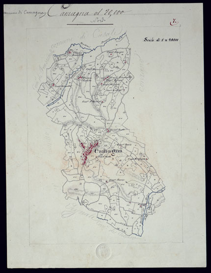 "Il titolo non è presente sulla carta. Gruppo di 51 mappe catastali di diversi comuni, impiegate con tutta probabilità per la costruzione della carta generale degli Stati Sardi al 50.000. Senza firma, eccetto due, firmate da Langrange, una riduzione del piano catastale del territorio d'Ivrea firmato Valsecchi 1822, e una riproduzione dei piani catastali di comuni della provincia d'Ivrea firmata Cap. Roggero."