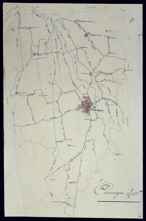 "Il titolo non è presente sulla carta. Gruppo di 51 mappe catastali di diversi comuni, impiegate con tutta probabilità per la costruzione della carta generale degli Stati Sardi al 50.000. Senza firma, eccetto due, firmate da Langrange, una riduzione del piano catastale del territorio d'Ivrea firmato Valsecchi 1822, e una riproduzione dei piani catastali di comuni della provincia d'Ivrea firmata Cap. Roggero."
