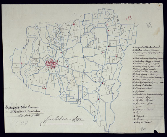 "Il titolo non è presente sulla carta. Gruppo di 51 mappe catastali di diversi comuni, impiegate con tutta probabilità per la costruzione della carta generale degli Stati Sardi al 50.000. Senza firma, eccetto due, firmate da Lagrange, una riduzione del piano catastale del territorio d'Ivrea firmato Valsecchi 1822, e una riproduzione dei piani catastali di comuni della provincia d'Ivrea firmata Cap. Roggero."