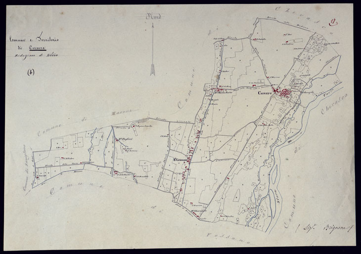 "Il titolo non è presente sulla carta. Gruppo di 51 mappe catastali di diversi comuni, impiegate con tutta probabilità per la costruzione della carta generale degli Stati Sardi al 50.000. Senza firma, eccetto due, firmate da Lagrange, una riduzione del piano catastale del territorio d'Ivrea firmato Valsecchi 1822, e una riproduzione dei piani catastali di comuni della provincia d'Ivrea firmata Cap. Roggero."
