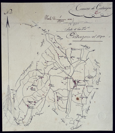 "Il titolo non è presente sulla carta. Gruppo di 51 mappe catastali di diversi comuni, impiegate con tutta probabilità per la costruzione della carta generale degli Stati Sardi al 50.000. Senza firma, eccetto due, firmate da Lagrange, una riduzione del piano catastale del territorio d'Ivrea firmato Valsecchi 1822, e una riproduzione dei piani catastali di comuni della provincia d'Ivrea firmata Cap. Roggero."