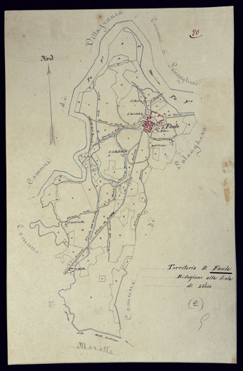 "Il titolo non è presente sulla carta. Gruppo di 51 mappe catastali di diversi comuni, impiegate con tutta probabilità per la costruzione della carta generale degli Stati Sardi al 50.000. Senza firma, eccetto due, firmate da Lagrange, una riduzione del piano catastale del territorio d'Ivrea firmato Valsecchi 1822, e una riproduzione dei piani catastali di comuni della provincia d'Ivrea firmata Cap. Roggero."