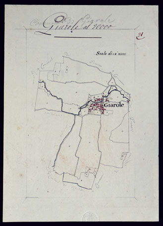 "Il titolo non è presente sulla carta. Gruppo di 51 mappe catastali di diversi comuni, impiegate con tutta probabilità per la costruzione della carta generale degli Stati Sardi al 50.000. Senza firma, eccetto due, firmate da Lagrange, una riduzione del piano catastaloe del territorio d'Ivrea firmato Valsecchi 1822, e una riproduzione dei piani catastali di comuni della provincia d'Ivrea firmata Cap. Roggero."