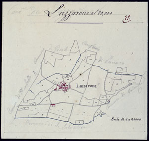 "Il titolo non è presente sulla carta. Gruppo di 51 mappe catastali di diversi comuni, impiegate con tutta probabilità per la costruzione della carta generale degli Stati Sardi al 50.000. Senza firma, eccetto due, firmate da Lagrange, una riduzione del piano catastale del territorio d'Ivrea firmato Valsecchi 1822, e una riproduzione dei piani catastali di comuni della provincia d'Ivrea firmata Cap. Roggero."