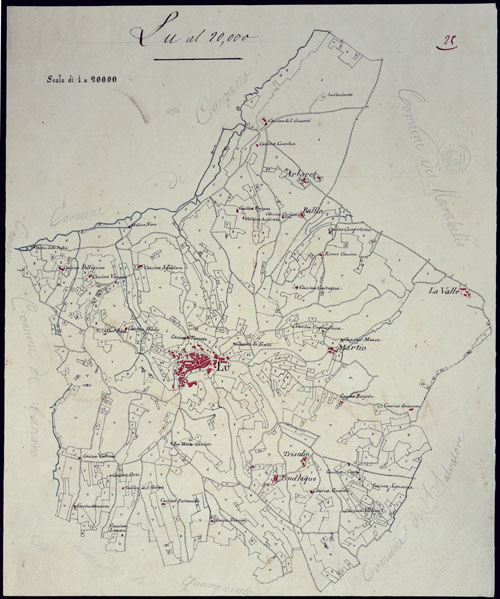 "Gruppo di 51 mappe catastali di diversi comuni, impiegate con tutta probabilità per la costruzione della carta generale degli Stati Sardi al 50.000. Senza firma, eccetto due, firmate da Langrange, una riduzione del piano catastale del territorio d'Ivrea firmato Valsecchi 1822, e una riproduzione dei piani catastali di comuni della provincia d'Ivrea firmata Cap. Roggero."