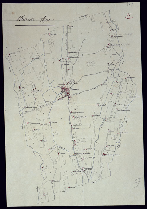 "Gruppo di 51 mappe catastali di diversi comuni, impiegate con tutta probabilità per la costruzione della carta generale degli Stati Sardi al 50.000. Senza firma, eccetto due, firmate da Lagrange, una riduzione del piano catastale del territorio d'Ivrea firmato Valsecchi 1822, e una riproduzione dei piani catastali di comuni della provincia d'Ivrea firmata Cap. Roggero."