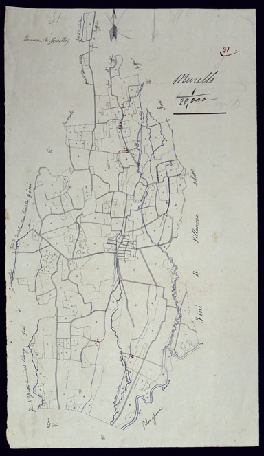 "Gruppo di 51 mappe catastali di diversi comuni, impiegate con tutta probabilità per la costruzione della carta generale degli Stati Sardi al 50.000. Senza firma, eccetto due, firmate da Lagrange, una riduzione del piano catastale del territorio d'Ivrea firmato Valsecchi 1822, e una riproduzione dei piani catastali di comuni della provincia d'Ivrea firmata Cap. Roggero."
