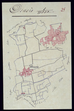 "Gruppo di 51 mappe catastali di diversi comuni, impiegate con tutta probabilità per la costruzione della carta generale degli Stati Sardi al 50.000. Senza firma, eccetto due, firmate da lagrange, una riduzione del piano catastale del territorio d'Ivrea firmato Valsecchi 1822, e una riproduzione dei piani catastali di comuni della provincia d'Ivrea firmata Cap. Roggero."