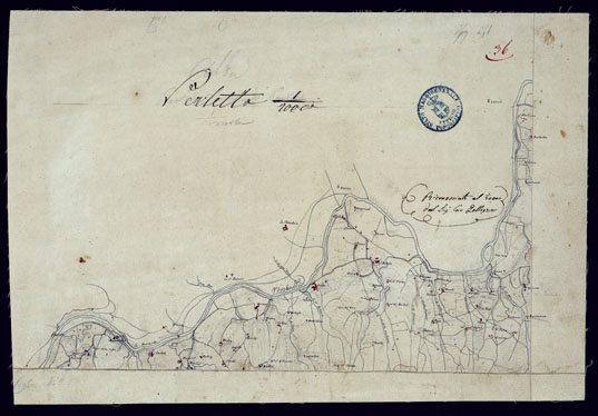 "Gruppo di 51 mappe catastali di diversi comuni, impiegate con tutta probabilità per la costruzione della carta generale degli Stati Sradi al 50.000. Senza firma, eccetto due, firmate da Lagrange, una riduzione del piano catastale del territorio d'Ivrea firmato Valsecchi 1822, e una riproduzione dei piani catastali di comuni della provincia d'Ivrea firmata Cap. Roggero."