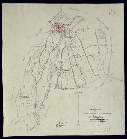 "Gruppo di 51 mappe catastali di diversi comuni, impiegate con tutta probabilità perla costruzione della carta generale degli Stati Sardi al 50.000. Senza firma, eccetto due, firmate da Lagrange, una riduzione del piano catastale del territorio d'ivrea firmato Valsecchi 1822, e una riproduzione dei piani catastali di comuni della provincia d'Ivrea Cap. Roggero."