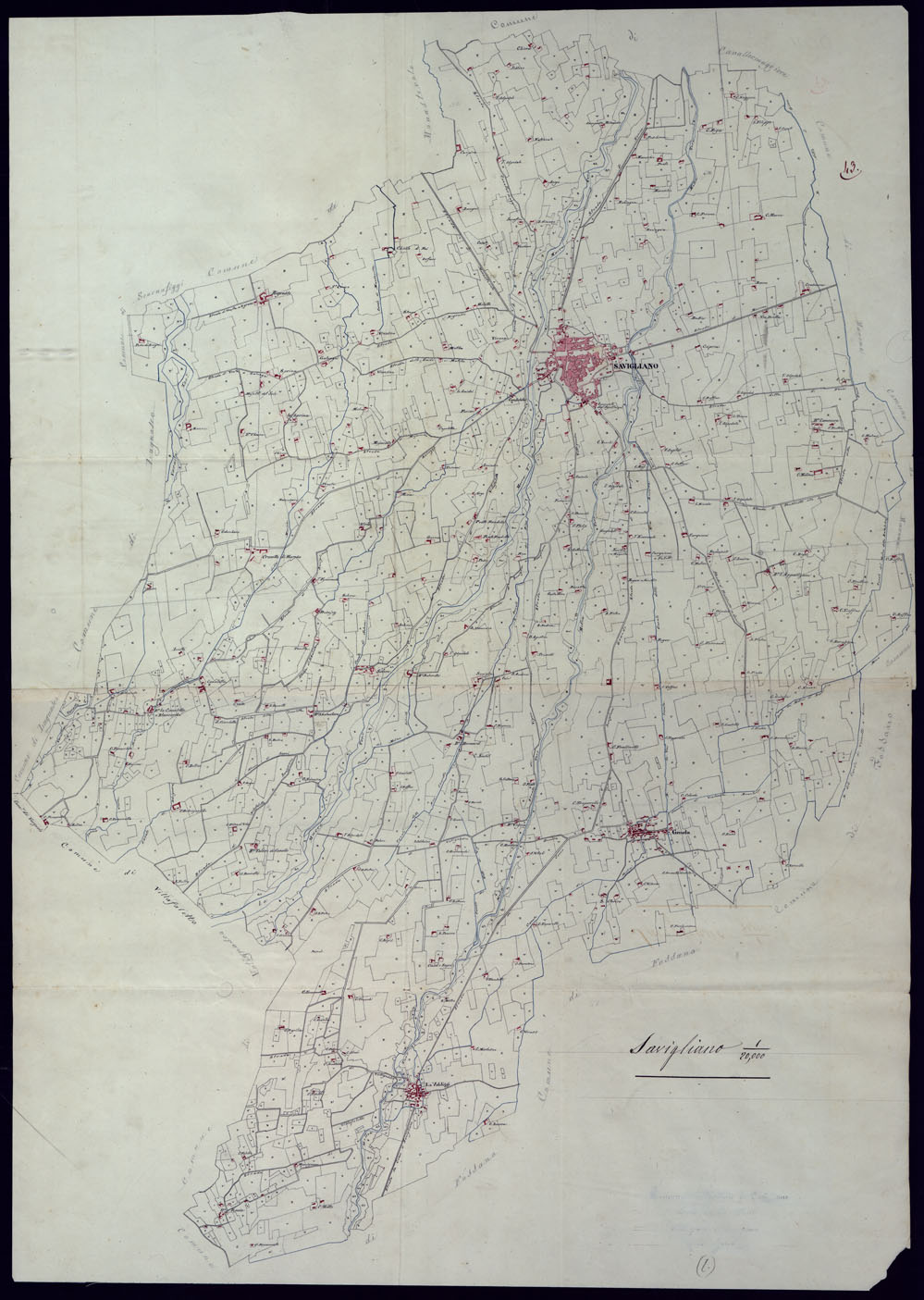 "Gruppo di 51 mappe catastali di diversi comuni, impiegate con tutta probabilità per la costruzione della carta generale degli Stati Sardi al 50.000. Senza firma, eccetto due, firmate da Lagrange, una riduzione del piano catastale del territorio d'Ivrea firmato Valsecchi 1822, e una riproduzione dei piani catastali di comuni della provincia d'Ivrea firmata Cap. Roggero."
