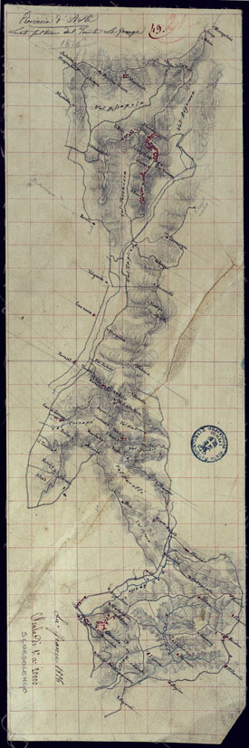 "Gruppo di 51 mappe catastali di diversi comuni, impiegate con tutta probabilità per la costruzione della carta generale degli Stati Sardi al 50.000. Senza firma, eccetto due, firmate da Lagrange, una riduzione del piano catastale del territorio d'Ivrea firmato Valsecchi 1822, e una riproduzione dei piani catastali di comuni della provincia d'Ivrea firmata Cap. Roggero."