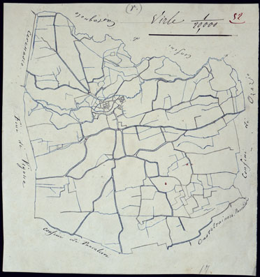 "Gruppo di 51 mappe catastali di diversi comuni, impiegate con tutta probabilità per la costruzione della carta generale degli Stati Sardi al 50.000. Senza firma, eccetto due, firmate da Lagrange, una riduzione del piano catastale del territorio d?vrea firmato Valsecchi 1822, e una riproduzione dei piani catastali di comuni della provbincia d'Ivrea firmata Cap. Roggero."