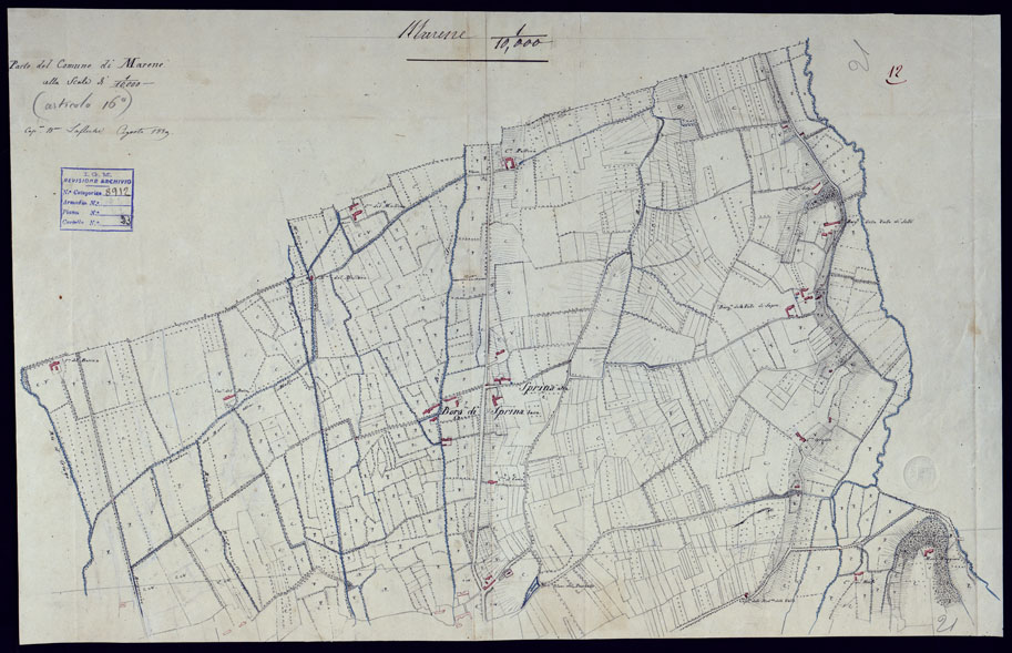 "Il titolo non è presente sulla carta. Gruppo di 16 mappe catastali riconosciute sul terreno probabilmente per la costruzione della carta generale degli Stati Sardi al 50.000. Alcune di esse recano le firme dei Cap.i Basso e Lafleche e del geometra Coda."