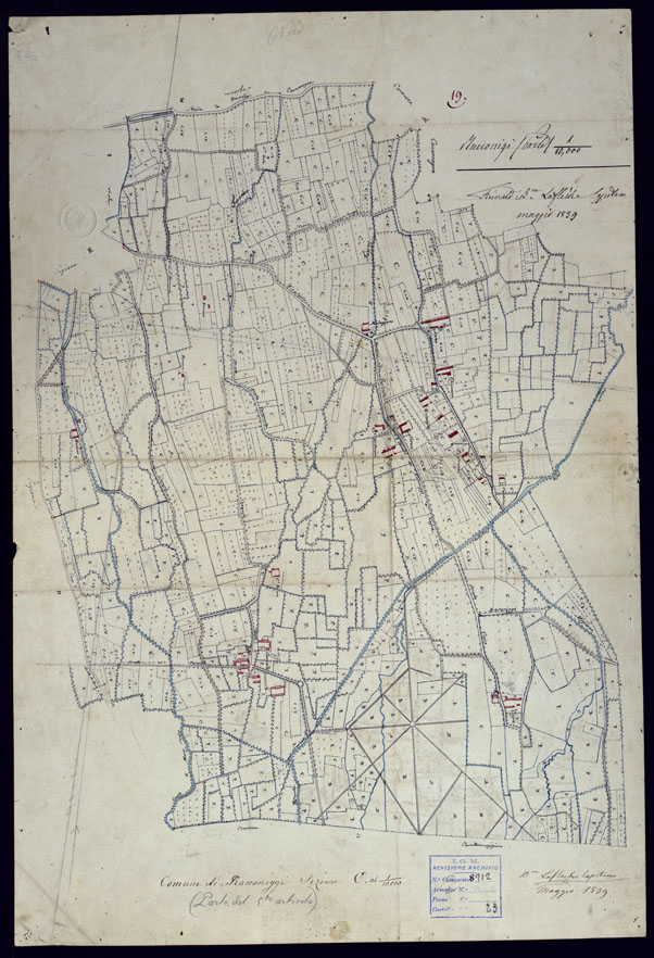 "Il titolo non è presente sulla carta. Gruppo di 16 mappe catastali riconosciute sul terreno probabilmente per la costruzione della carta generale degli Stati Sardi al 50.000. Alcune di esse recano le firme dei Cap.i Basso e Lafleche e del geometra Coda."
