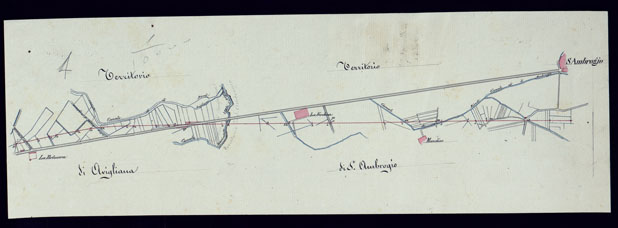 "Planimetrie di vari tronchi di ferrovia. Epoca 1851-1871. Disegni ad acquerello impiegati probabilmente per la carta generale degli Stati Sardi al 50.000."
