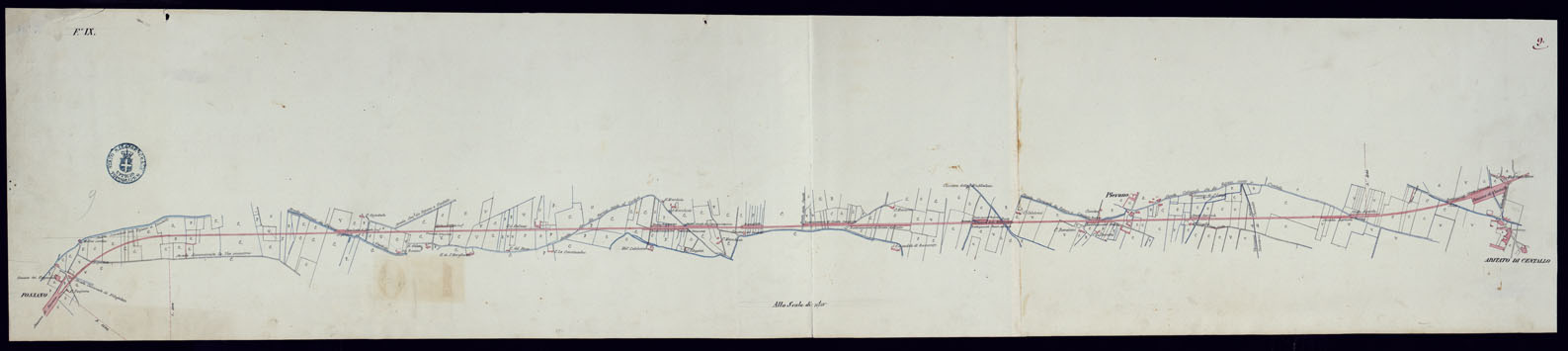 "Il titolo non è presente sulla carta. Planimetrie di vari tronchi di ferrovia. Epoca 1851-1871. Disegni ad acquerello impiegati probabilmente per la carta generale degli Stati Sardi al 50.000."