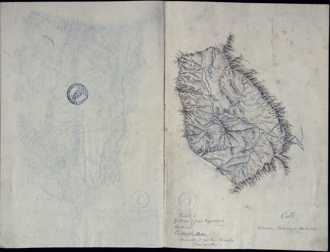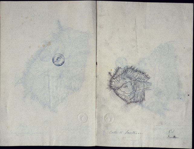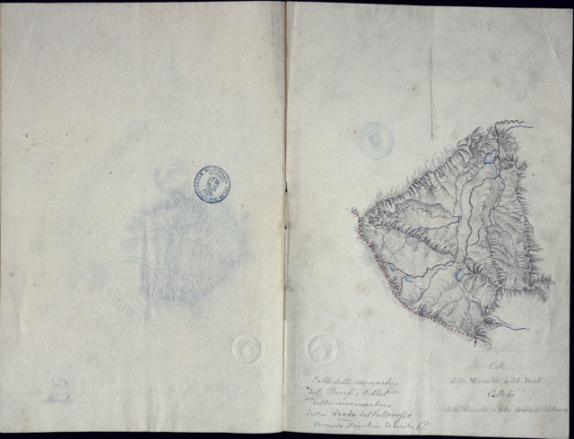 "Quaderno con schizzi in lapis dei Colli di Maurin, Rons, Giavriera, Gibiera, Nubiera, Portioletto, Santron delle Monache, del Boeuf, Collet delle Monache, della drada del Vallonasso. Senza data, senza firma. Scala dei singoli disegni 1:5000."