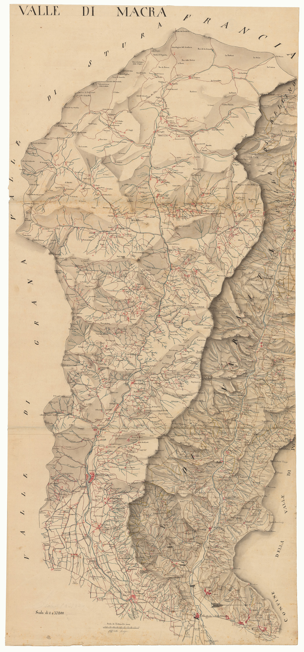 "Disegno ad acquerello con orografia a sfumo a luce obliqua, abitati in rosso, acque in azzurro, strade in rosso e in giallo. E' orientato col nord volto verso destra."