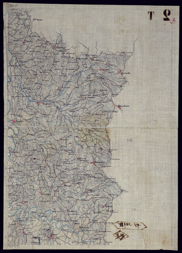"Disegno ad acquerello in 9 fogli di carta vegetale montati su tela. Orografia a curve di livello e sfumo, abitati in rosso, acque in azzurro."