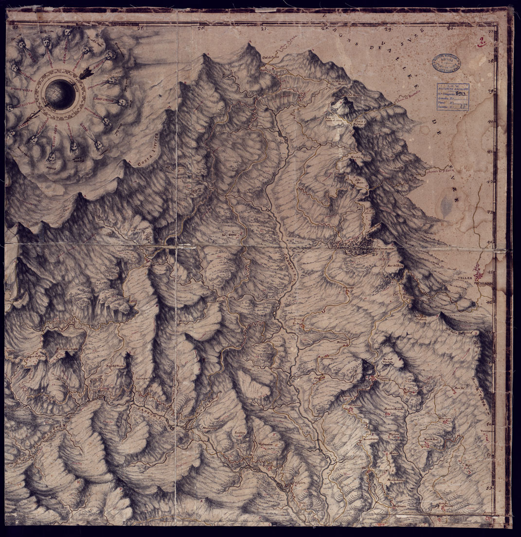 "Les Mandem de Giavenne, cumiane &cc avec tout cé qui en dependt ou sont distingues generalement touts les chemins et passages, de Pinerol, iusques au mont Genevre et aucol du vent vis a vis de suze, avec des remarques tres particulieres et necessaires. Bella antica carta disegnata ad acquerello, in quattro fogli montati su tela è pregevole sopratutto per la evidenza con cui è rappresentato l'orografia a disegno misto di ombreggiamento e tratteggio, e il particolare rilievo dato alla rete stradale, per scopi militari. Gli abitati sono rappresentati in pianta e riempiti in rosso. Le strade sono distinte in due classi: facilmente percorribili (gialli) e di difficile percorribilità (rosso). A destra del foglio sud-orientale una leggenda reca notizie sulla percorribilità delle vie e dei passi montani. Altre indicazioni sulla accessibilità della regione sono date in vari punti sullo stesso disegno. Quattro scale grafiche in miglia d'Italia, di Francia, di Piemonte e comuni. La carta è orientata col nord volto verso il lato destro del disegno. Il documento n°193 è la copia della carta descritta, eseguita artisticamente da Vittorio Brambilla., è senza la data, ma risale con tutta probabilità a dopo il 1820."