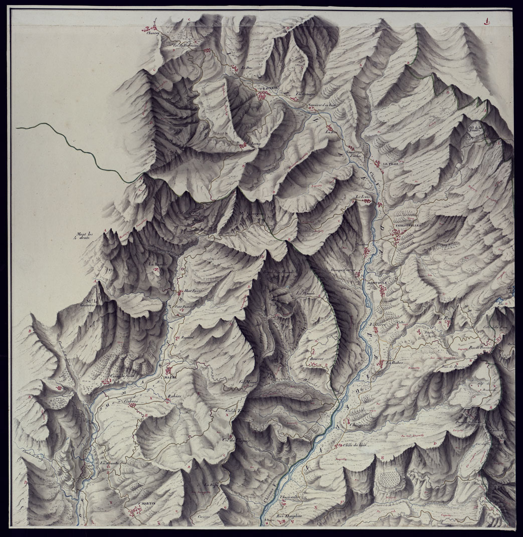 "VERS LE PIEMONT, OU SONT LES VALLEES DE PRAGELAT DE LA PEROU SE ET S. MARTINLES MANDEM DE GIAVENNE, CUMIANE AVEC TOUT CE' QUI EN DEPENDT OU SONT DISTINGUES GENERALEMENT TOUTS LES CHEMINS ET PASSAGES, DE PINEROL, IUSQUES AU MONT-GENEVRE ET AU COL DU VENT VIS-A-VIS DE SUSE, AVEC DES REMARQUES TRES PARTICULIERES ET NECESSAIRES LEVEE SUR LES LIUX L'AN 1693 PAR VARIN DE LA MARCHE. Il documento è la copia della carta al documento n. 192, eseguita artisticamente da Vittorio Brambilla. E' senza data, ma risale con tutta probabilità a dopo il 1820"