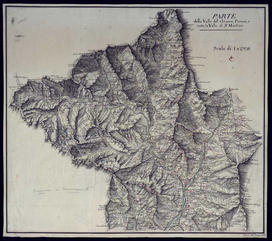"Disegno ad acquerello in foglio unico firmato Degrandi Ing. Top. di S.M. Orografia a sfumo a luce obliqua, abitazione in rosso, acque in azzurro, strade in giallo. Sono particolarmente indicate le opere fortificatorie."