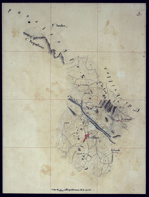 VALLE DELLA DORA EXILLES MINUTE AL 10.000. RILIEVI ESEGUITI NEL 1864 ALLIEVI INGEGNERI DEL R. CORPO DEL GENIO CIVILE ALLA SCALA DI 1 A 10.000 - FOGLIO 3.