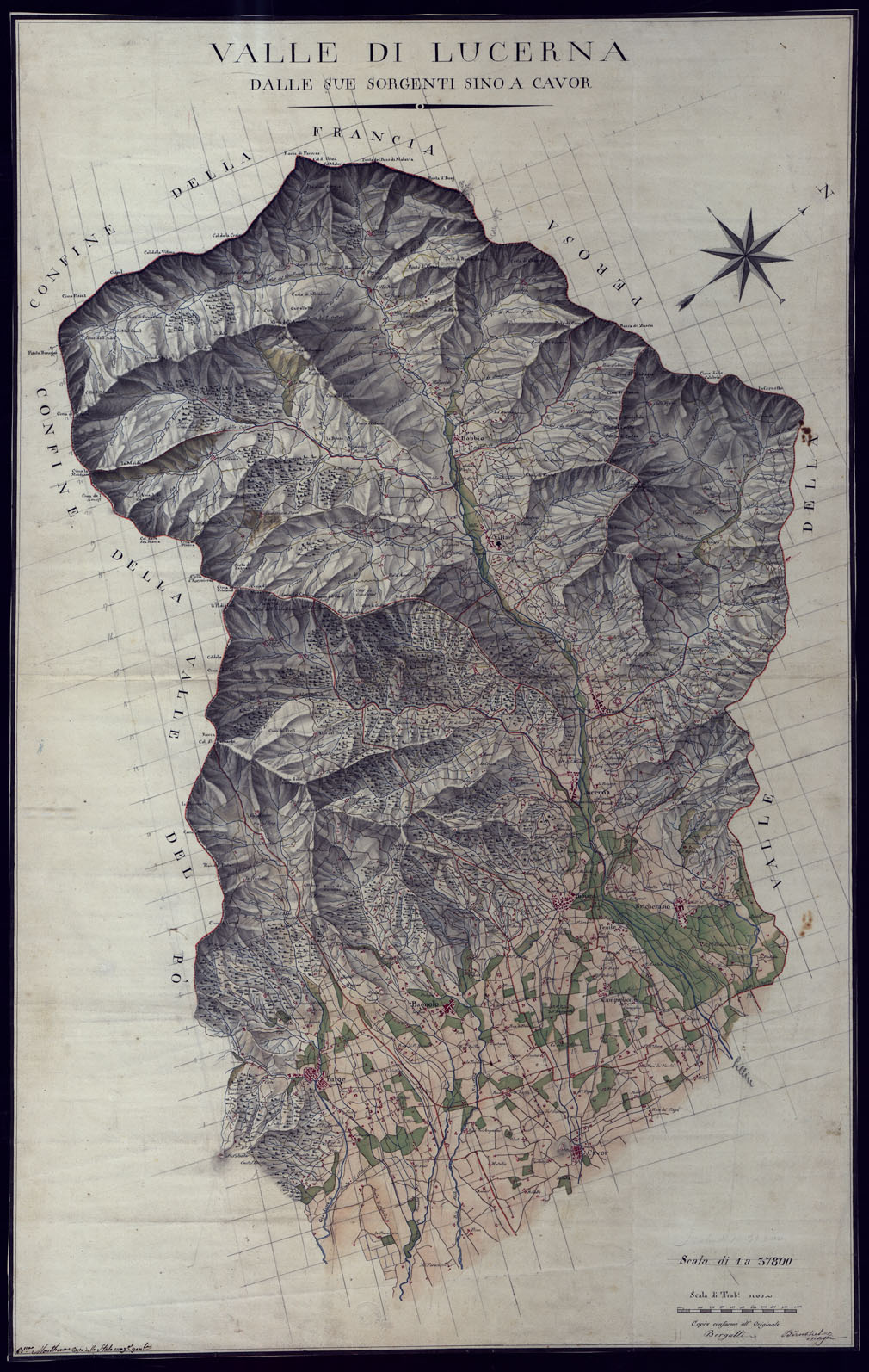 "Copia conforme all'originale firmata Bergalli, vistata dal Magg. Birustici e dal Bar. di Monthoux. Artistico ed accurato disegno ad acquerello con orografia a sfumo a luce obliqua, acque in azzurro, abitati in rosso, colture e vegetazioni in verde e in giallino, strade e linee punteggiate ripassate in tinta. Scala grafica in trabucchi. Il disegno è orientato col nord volto verso il lato destro del foglio."