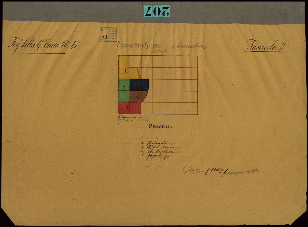 GRUPPO DI 132 FRAZIONI DI MINUTE DI CAMPAGNA ALLA SCALA 1:10.000 DEI RILEVAMENTI ESEGUITI NEL 1853-1867 - OZZANO - FASCICOLO 2 - QUADRO D'UNIONE DEI RILIEVI DEGLI OPERATORI DEL FOGLIO DELLA GRAN CARTA N. 47.
