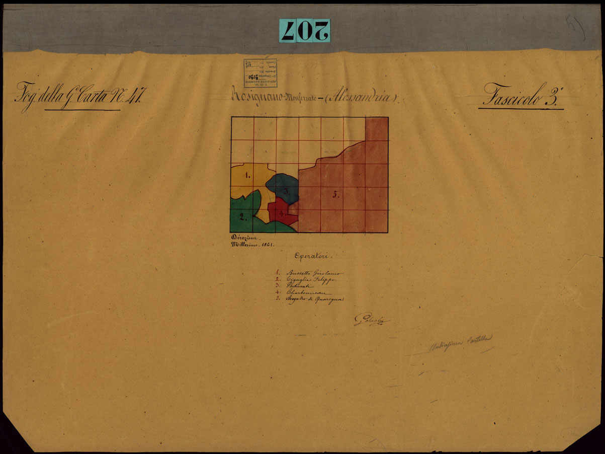 "Gruppo di porzioni di minute di campagna alla scala di 1:10.000, dei rilevamenti eseguiti nel 1853-1867 che servirono per la compilazione delle tavolette del documento n. 206. Sono riunite a fascicoli ognuno con un quadro d'unione dei singoli rilevamenti eseguiti, per ciascuna tavoletta è riportato il nome degli operatori. Il documento è suddiviso nelle cartelle 27 e 28."