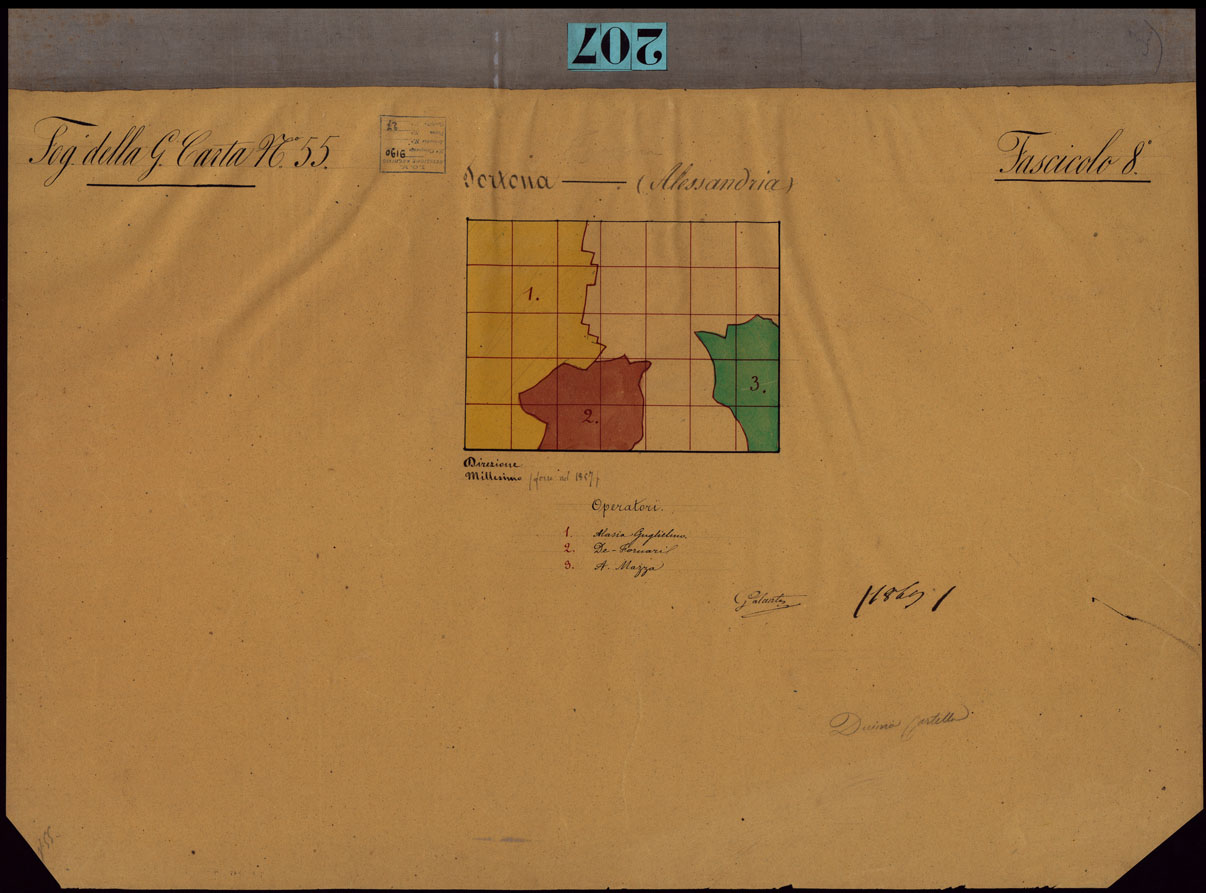 GRUPPO DI 132 FRAZIONI DI MINUTE DI CAMPAGNA ALLA SCALA 1:10.000 DEI RILEVAMENTI ESEGUITI NEL 1853-1867 - TORTONA - FASCICOLO 8 - QUADRO D'UNIONE DEI RILIEVI DEGLI OPERATORI DEL FOGLIO DELLA GRAN CARTA N. 55.