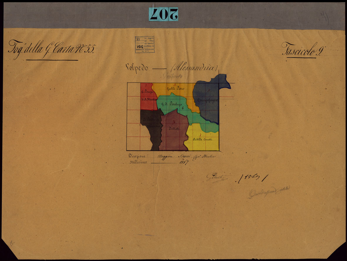 GRUPPO DI 132 FRAZIONI DI MINUTE DI CAMPAGNA ALLA SCALA 1:10.000 DEI RILEVAMENTI ESEGUITI NEL 1853-1867 - VOLPEDO - FASCICOLO 9 - QUADRO D'UNIONE DEI RILIEVI DEGLI OPERATORI DEL FOGLIO DELLA GRAN CARTA N. 55.