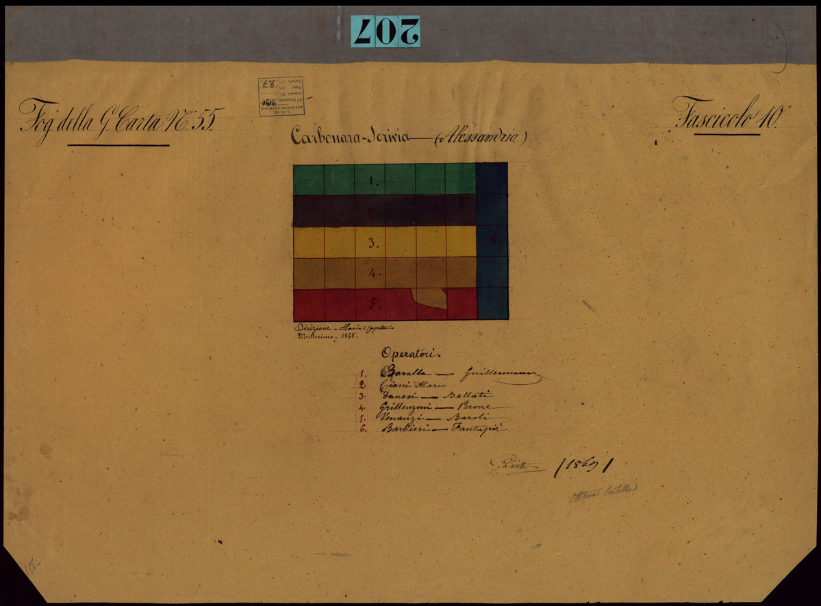 GRUPPO DI 132 FRAZIONI DI MINUTE DI CAMPAGNA ALLA SCALA 1:10.000 DEI RILEVAMENTI ESEGUITI NEL 1853-1867 - CARBONARA - FASCICOLO 10 - QUADRO D'UNIONE DEI RILIEVI DEGLI OPERATORI DEL FOGLIO DELLA GRAN CARTA N.55.