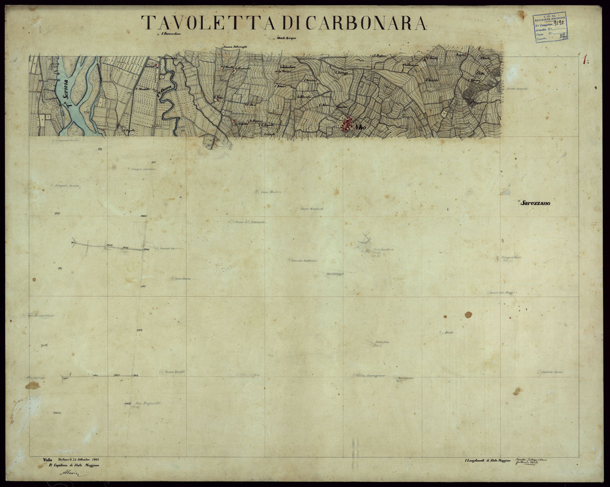 "Gruppo di porzioni di minute di campagna alla scala di 1:10.000, dei rilevamenti eseguiti nel 1853-1867 che servirono per la compilazione delle tavolette del documento n. 206. Sono riunite a fascicoli ognuno con un quadro d'unione dei singoli rilevamenti eseguiti, per ciascuna tavoletta è riportato il nome degli operatori. Il documento è suddiviso nelle cartelle 27 e 28."