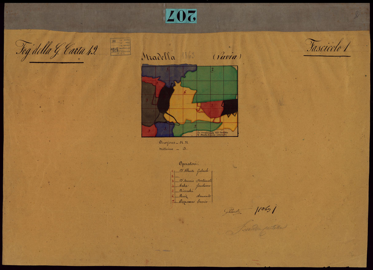 "Gruppo di porzioni di minute di campagna alla scala di 1:10.000, dei rilevamenti eseguiti nel 1853-1867 che servirono per la compilazione delle tavolette del documento n. 206. Sono riunite a fascicoli ognuno con un quadro d'unione dei singoli rilevamenti eseguiti, per ciascuna tavoletta è riportato il nome degli operatori. Il documento è suddiviso nelle cartelle 27 e 28."