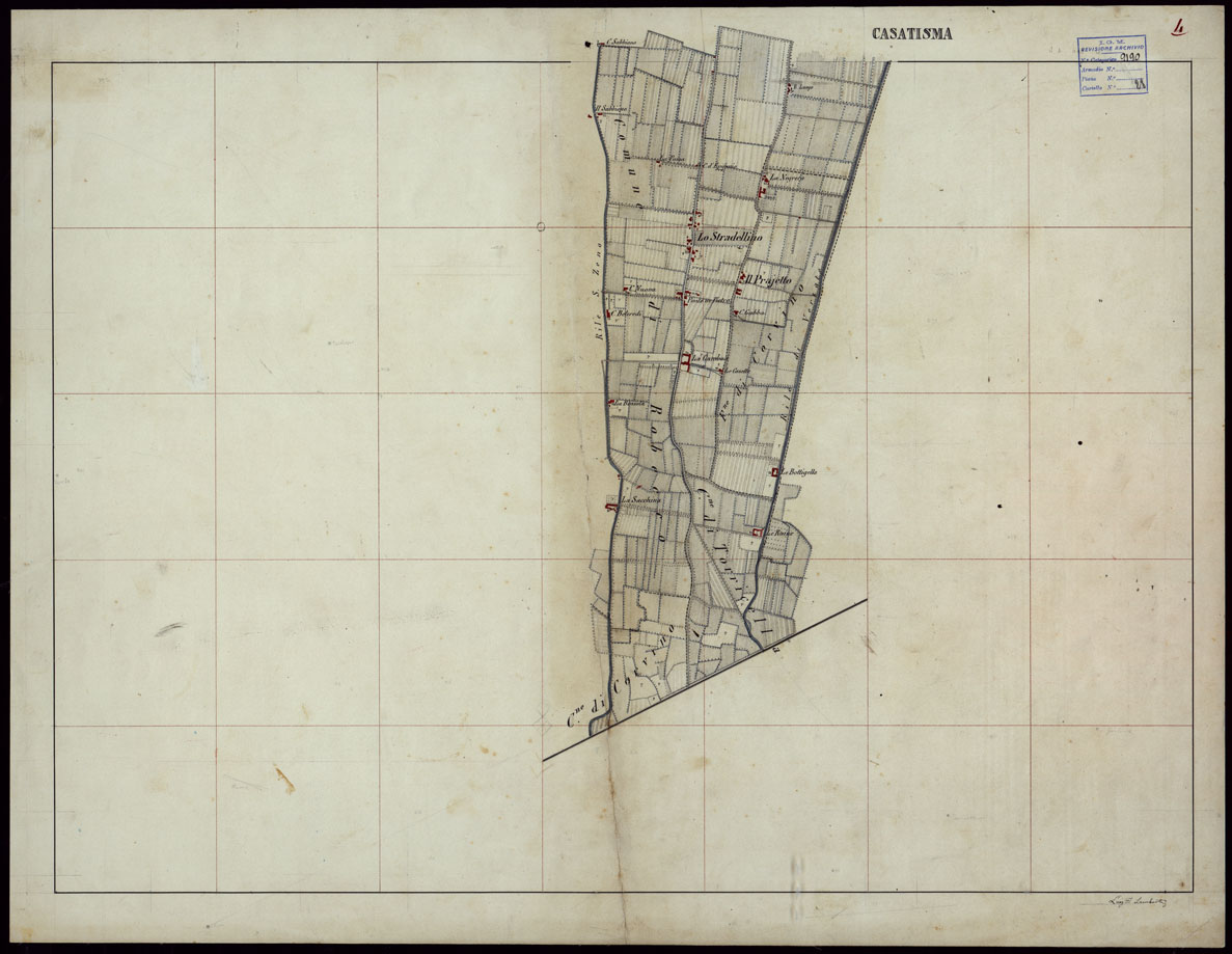 "Gruppo di porzioni di minute di campagna alla scala di 1:10.000, dei rilevamenti eseguiti nel 1853-1867 che servirono per la compilazione delle tavolette del documento n. 206. Sono riunite a fascicoli ognuno con un quadro d'unione dei singoli rilevamenti eseguiti, per ciascuna tavoletta è riportato il nome degli operatori. Il documento è suddiviso nelle cartelle 27 e 28."