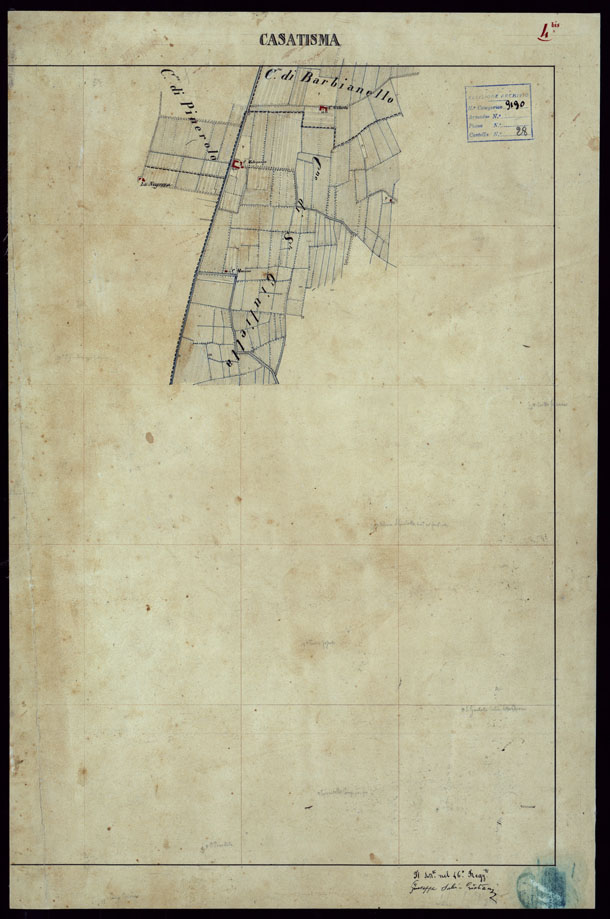 "Gruppo di porzioni di minute di campagna alla scala di 1:10.000, dei rilevamenti eseguiti nel 1853-1867 che servirono per la compilazione delle tavolette del documento n. 206. Sono riunite a fascicoli ognuno con un quadro d'unione dei singoli rilevamenti eseguiti, per ciascuna tavoletta è riportato il nome degli operatori. Il documento è suddiviso nelle cartelle 27 e 28."