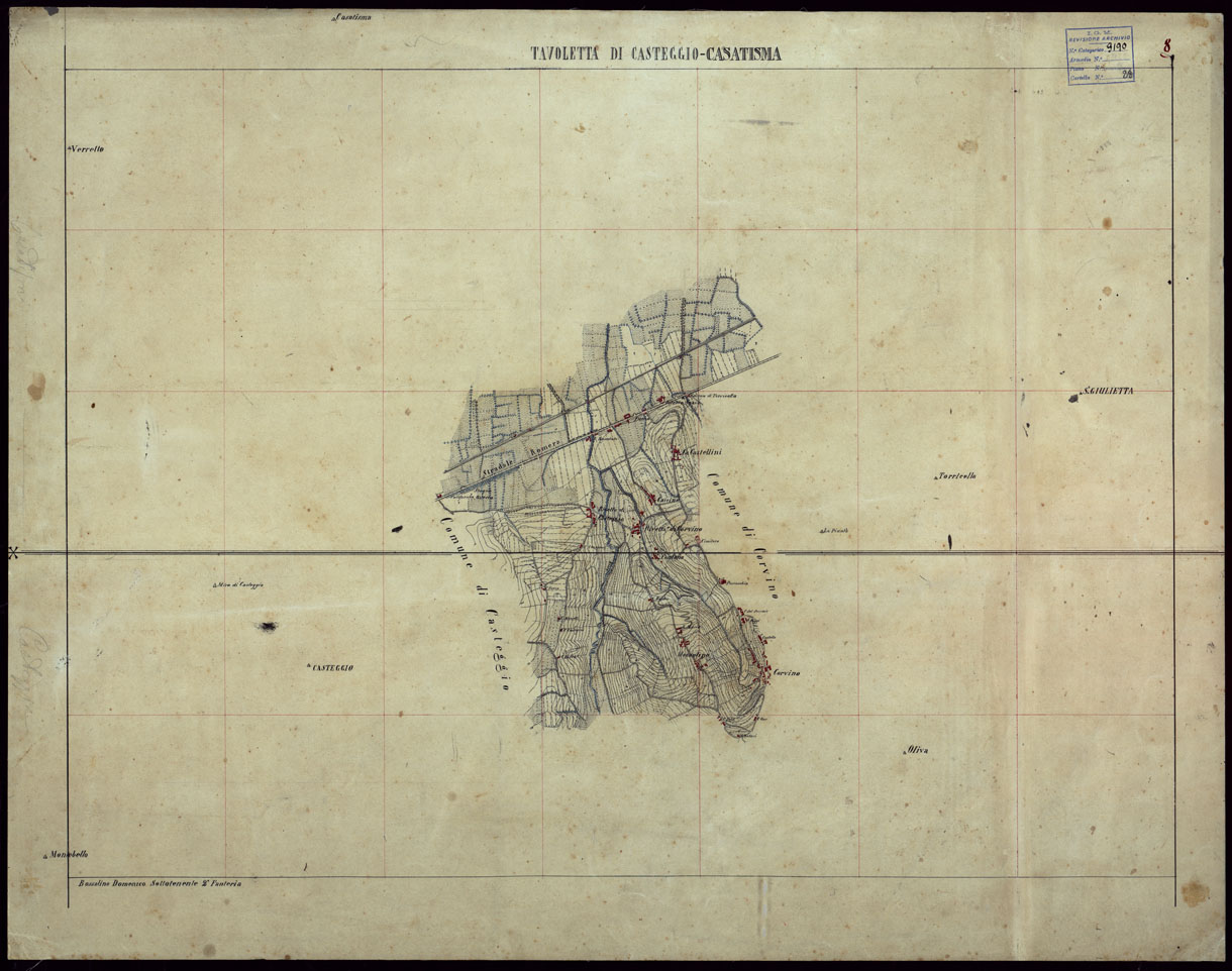 "Gruppo di porzioni di minute di campagna alla scala di 1:10.000, dei rilevamenti eseguiti nel 1853-1867 che servirono per la compilazione delle tavolette del documento n. 206. Sono riunite a fascicoli ognuno con un quadro d'unione dei singoli rilevamenti eseguiti, per ciascuna tavoletta è riportato il nome degli operatori. Il documento è suddiviso nelle cartelle 27 e 28."