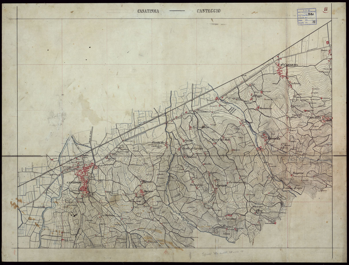 "Gruppo di porzioni di minute di campagna alla scala di 1:10.000, dei rilevamenti eseguiti nel 1853-1867 che servirono per la compilazione delle tavolette del documento n. 206. Sono riunite a fascicoli ognuno con un quadro d'unione dei singoli rilevamenti eseguiti, per ciascuna tavoletta è riportato il nome degli operatori. Il documento è suddiviso nelle cartelle 27 e 28."