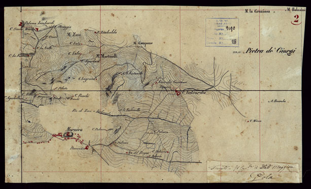 "Gruppo di porzioni di minute di campagna alla scala di 1:10.000, dei rilevamenti eseguiti nel 1853-1867 che servirono per la compilazione delle tavolette del documento n. 206. Sono riunite a fascicoli ognuno con un quadro d'unione dei singoli rilevamenti eseguiti, per ciascuna tavoletta è riportato il nome degli operatori. Il documento è suddiviso nelle cartelle 27 e 28."