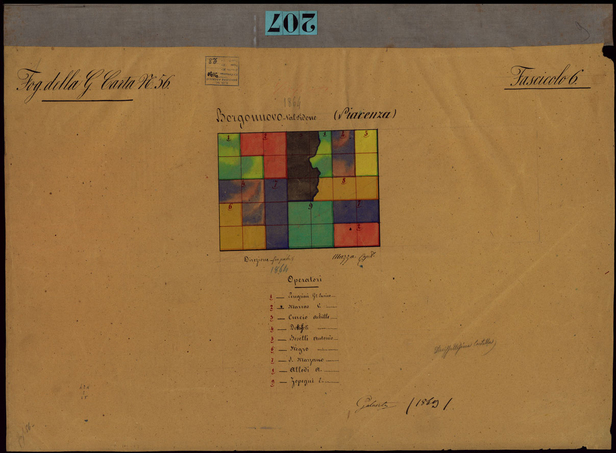 GRUPPO DI 132 FRAZIONI DI MINUTE DI CAMPAGNA ALLA SCALA 1:10.000 DEI RILEVAMENTI ESEGUITI NEL 1853-1867 - BORGONUOVO - FASCICOLO 6 - QUADRO D'UNIONE DEI RILIEVI DEGLI OPERATORI DEL FOGLIO DELLA GRAN CARTA N.56.