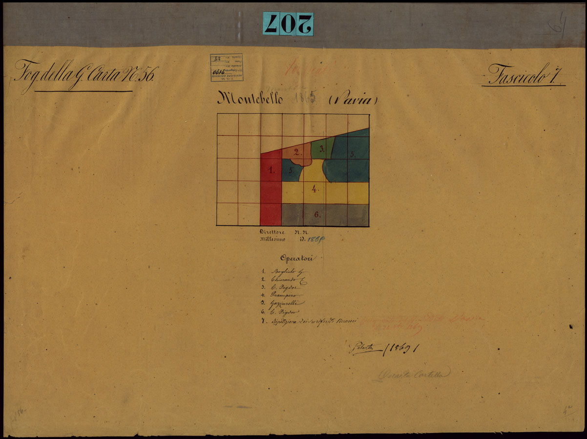 GRUPPO DI 132 FRAZIONI DI MINUTE DI CAMPAGNA ALLA SCALA 1:10.000 DEI RILEVAMENTI ESEGUITI NEL 1853-1867 - MONTEBELLO - FASCICOLO 7 - QUADRO D'UNIONE DEI RILIEVI DEGLI OPERATORI DEL FOGLIO DELLA GRAN CARTA N.56.